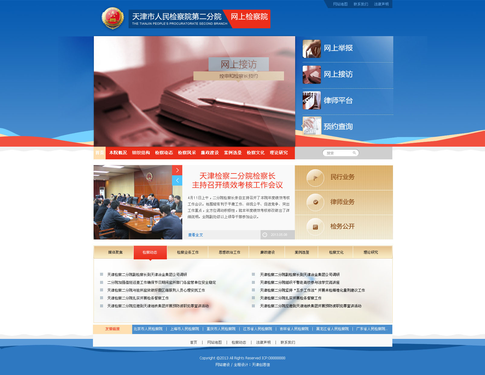 全稱為“天津市人民檢察院第二分院”,坐落于天津市河西區(qū)新圍堤道8號(hào)(郵政編碼300210)。本院成立于1995年12月,1996年初正式掛牌辦公,級(jí)別為正廳(局)級(jí)......