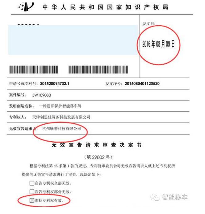 終于等到了這一天:中國(guó)專利復(fù)審委宣判智能移車專利權(quán)全部有效,大大提升維權(quán)保障,保護(hù)各個(gè)商家和用戶利益!