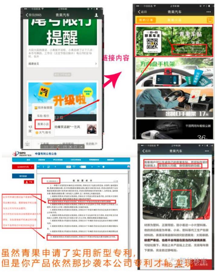 D、天津青果汽車(2015推出的青果車貼抄襲侵權(quán),被微信處罰后,2016年居然申請(qǐng)了專利,而且專利授權(quán)了,但我們專利已經(jīng)在先一年,有專利,但產(chǎn)品依然必須采用本公司專利才能實(shí)現(xiàn)挪車功能,再次向微信舉報(bào),微信刪除其侵權(quán)內(nèi)容。我們將保留追究專利侵權(quán)的一切法律權(quán)利,同時(shí)在必要時(shí)將提出專利無效宣告)
