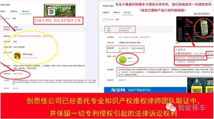 E、車名片二代掃碼挪車卡侵犯本公司專利權(quán),我們已經(jīng)向微信舉報(bào)后微信刪除其產(chǎn)品介紹鏈接內(nèi)容,相關(guān)信息已經(jīng)由專業(yè)維權(quán)律師團(tuán)隊(duì)取證,我們將保留追究專利侵權(quán)的一切法律權(quán)利。